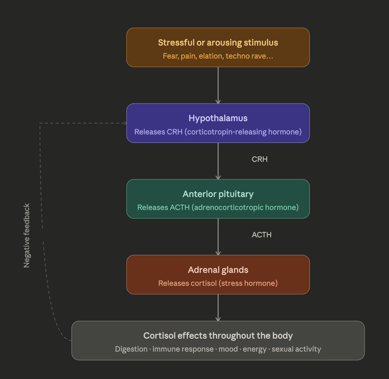 When you are frightened, elated, in pain, or apparently when you are at a techno rave, this system activates. The process works as a chain reaction: in response to a stressful or arousing situation, the hypothalamus releases corticotropin-releasing hormone (CRH), which triggers the anterior pituitary to release ACTH, which in turn triggers the adrenal glands to release cortisol.